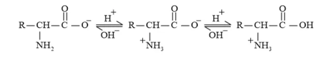 Example: In the zwitter ion given below, the $\mathrm{COO}^{-}$ion accepts a proton to form a cation in the presence of acidic medium. While in basic medium the $\mathrm{NH}_{3}^{+}$ion loses a proton to form anion.