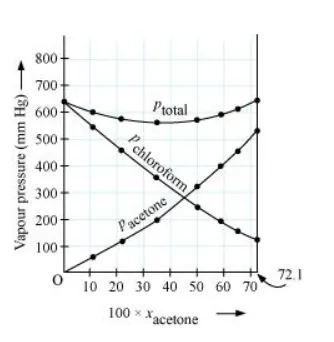 Question $37:$ Vapour pressure of pure acetone and chloroform at $328 \mathrm{~K}$ are $741.8 \mathrm{~mm} \mathrm{Hg}$ and $632.8 \mathrm{~mm} \mathrm{Hg}$ respectively. Assuming that they form ideal solution over the entire range of composition, plot $p_{\text {total }} P_{\text {chloroform' }}$ and $p_{\text {acetone }}$ as a function of $x_{\text {acetone }}$. The experimental data observed for different compositions of mixture is.