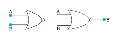 (Hint: $\mathrm{A}=0, \mathrm{~B}=1$ then $\mathrm{A}$ and $\mathrm{B}$ inputs of second NOR gate will be 0 and hence $\mathrm{Y}=1$. Similarly work out the values of $\mathrm{Y}$ for other combinations of $\mathrm{A}$ and $\mathrm{B}$. Compare with the truth table of OR, AND, NOT gates and find the correct one.)