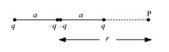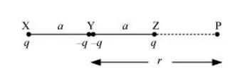 Suppose point P is outside the system of two charges at a distance s from the negative charge, where potential is zero, as shown in the following figure.