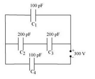 Equivalent capacitance $\left(C^{\prime}\right)$ of the combination of the capacitors is given by the relation,