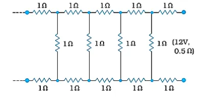 Question 21. Determine the current drawn from a $12 \mathrm{~V}$ supply with internal resistance $0.5 \Omega$ by the infinite network shown in Fig. Each resistor has $1 \Omega$ resistance.