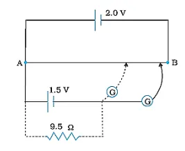 Question 23. The figure shows a $2.0 \mathrm{~V}$ potentiometer used for the determination of internal resistance of a $1.5 \mathrm{~V}$ cell. The balance point of the cell in open circuit is $76.3 \mathrm{~cm}$. When a resistor of $9.5 \Omega$ is used in the external circuit of the cell, the balance point shifts to $64.8 \mathrm{~cm}$ length of the potentiometer wire. Determine the internal resistance of the cell.