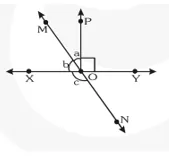 Q2. In figure, lines $\mathrm{XY}$ and $\mathrm{MN}$ intersect at $\mathrm{O}$. If $\angle \mathrm{POY}=90^{\circ}$ and $\mathrm{a}: \mathrm{b}=2: 3$, find $\mathrm{c}$.