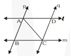 Q4. $\ell$ and $\mathrm{m}$ are two parallel lines intersected by another pair of parallel lines $\mathrm{p}$ and $\mathrm{q}$. Show that $\Delta \mathrm{ABC} \cong \Delta \mathrm{CDA}$