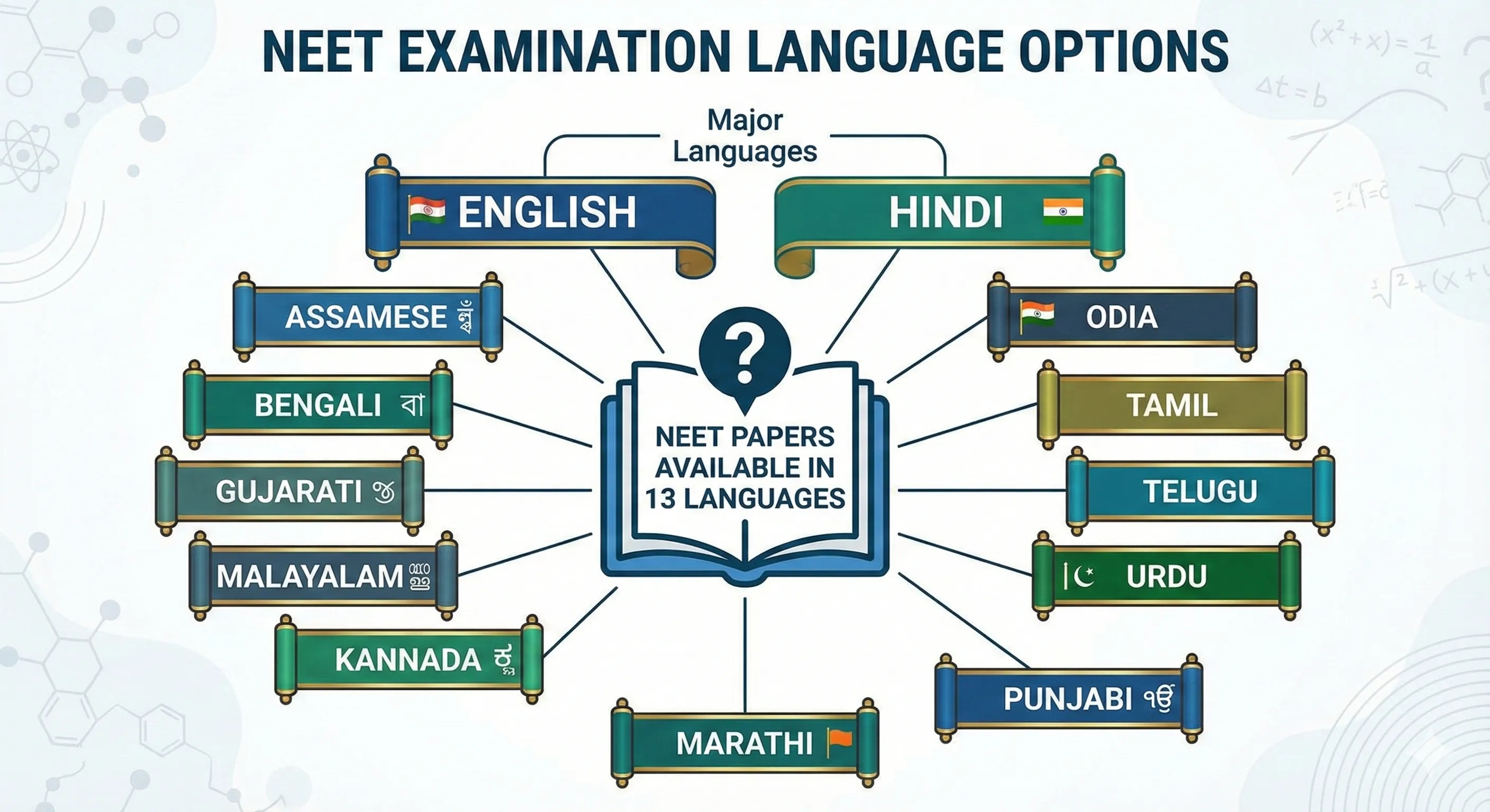 As of 2023, NEET is conducted in 13 languages including English, Hindi, Assamese, Bengali, Gujarati, Malayalam, Kannada, Marathi, Odia, Tamil, Telugu, Urdu, and Punjabi.