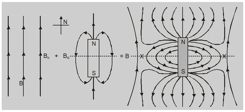 A neutral point in the magnetic field of a bar magnet is that point where the field due to the magnet is completely neutralized by the horizontal component of the earth's magnetic field. At neutral point field due to bar magnet (B) is equal and opposite to horizontal component of earth's magnetic field $\left( B _{ H }\right) or \quad B = B _{ H }$