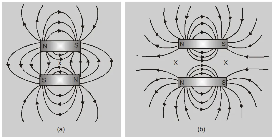(b) If two bar magnets are placed with their axis parallel to each other and their like poles face each other then there are two neutral points on a line equidistant from the axis of the magnets.