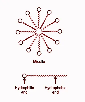 HC-Oily droplet + IH-Water → Micelle Micelle + Dirt → Micelle-Dirt complex Micelle-Dirt complex + Water → Solution