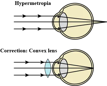 8. Hypermetropia, hyperopia, or long sightedness : A person suffering from this defect can see distant objects I clearly but cannot see nearby objects clearly. In this defect, the near point lies farther away than 25 cm. Hypermetropia (far sightedness — the image of nearby objects is focussed beyond the retina) is corrected by using a convex lens of suitable power. The eye loses