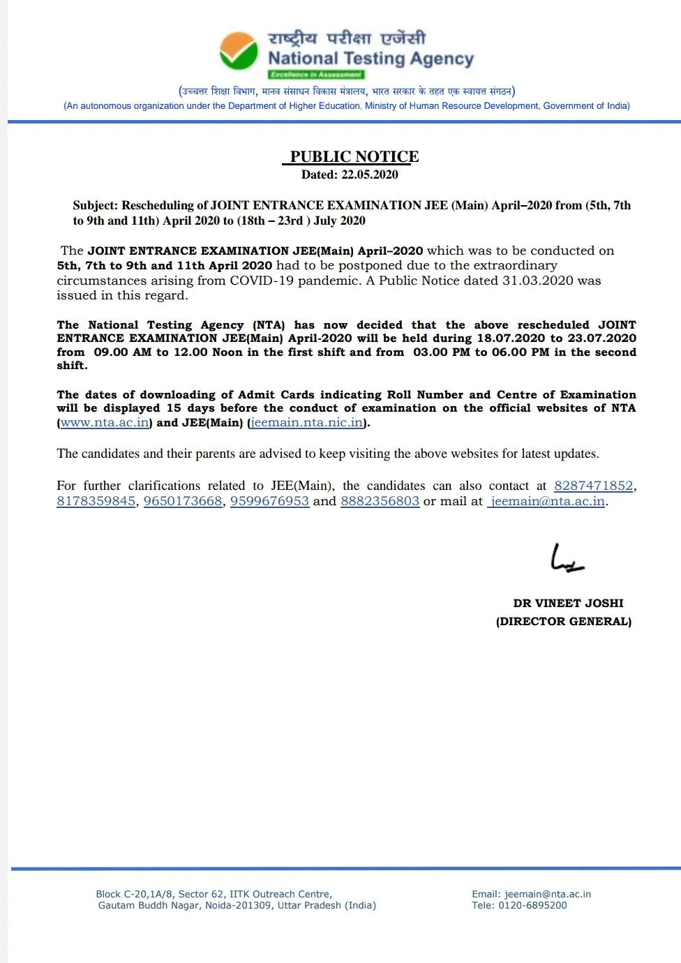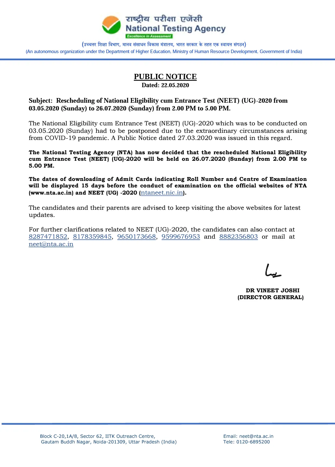 NEET 2020: Public Notice by NTA