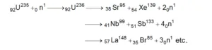 ${ }_{92} \mathrm{U}^{235}+{ }_{0} \mathrm{n}^{1} \longrightarrow{ }_{2}{ }_{2} \mathrm{U}^{236} \longrightarrow{ }_{56} \mathrm{Ba}^{141}+{ }_{36} \mathrm{Kr}^{92}+3{ }_{0} \mathrm{n}^{1}+$ energy $\mathrm{y}$- U235 nucleus captures a thermal neutron