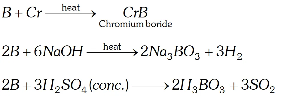 Q. How does boron react with (i) metals like $C r$ (ii) $N a O H$