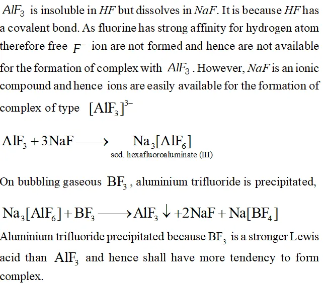 Q. $A I F_{3}$ is insoluble in anhydrous $H F$ but dissolves on addition of $\mathrm{NaF.}$ Aluminium trifluoride precipitates when gaseous $B F_{3}$ is bubbled through it. Give reasons. $\quad$