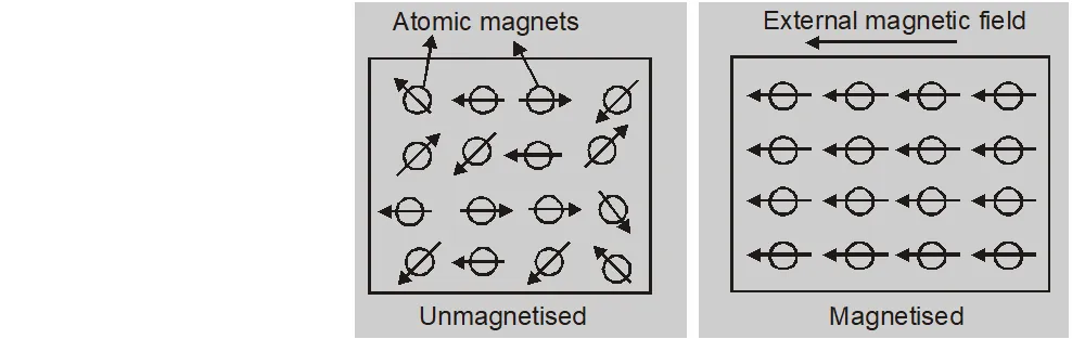 (4) In presence of external field each atomic magnet experiences a torque which tries to rotate and align them parallel to direction of magnetic field. The substance acquires net dipole moment and thus gets magnetised in direction of field.