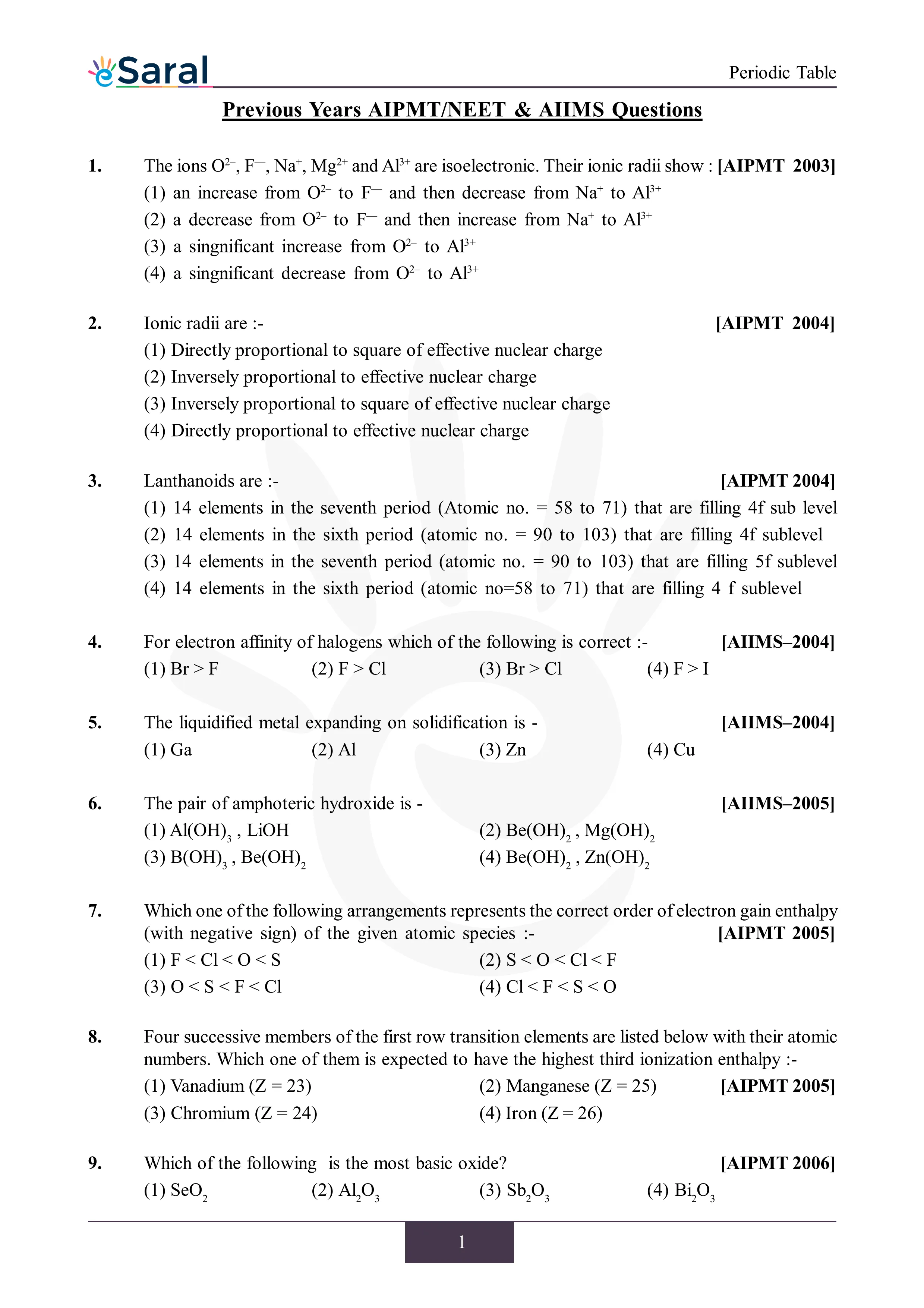 JEE Mains & AdvancedHere you will get Complete Periodic Table NEET Previous Year Questions with complete and detailed solutions.
