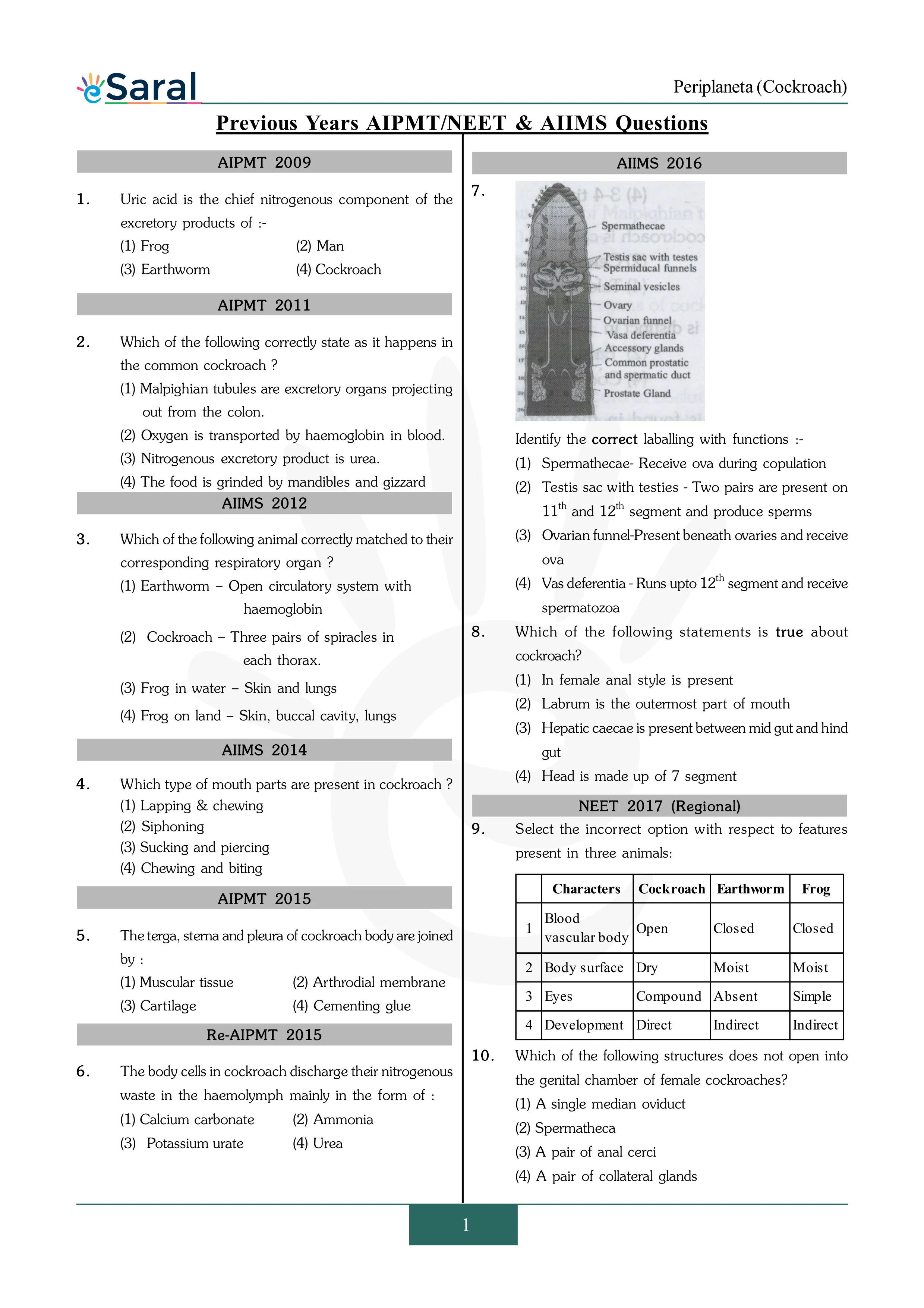 Here you will get Complete Periplaneta (Cockroach) NEET Previous Year Questions with complete and detailed solutions.