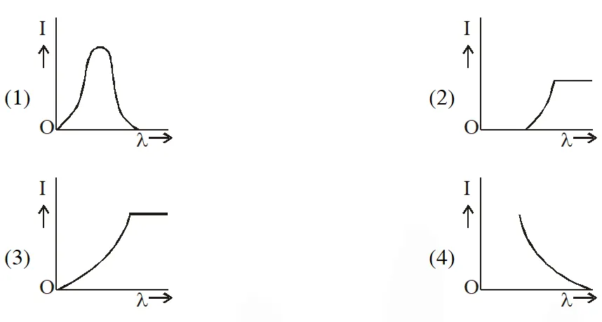 Q. The anode voltage of photocell is kept fixed. The wavelength $\lambda$ of the light falling on the cathode is gradually changed. The plate current I of the photocell varies as follows