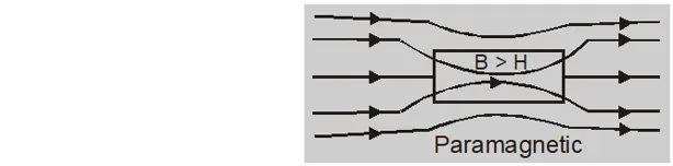 - The relative permeability $\mu_{\mathrm{r}}=\frac{\mu}{\mu_{0}}$ is slightly greater than one. The field $B$ inside the material $B$ is greater than magnetising field H. They have a tendency to pull in the lines of force.