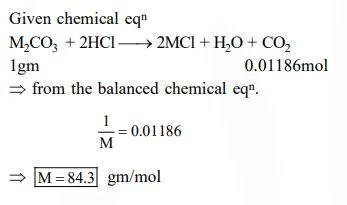 1 gram of a carbonate $\left(\mathrm{M}_{2} \mathrm{CO}_{3}\right)$ on treatment with excess $\mathrm{HCl}$ produces $0.01186$ mole of $\mathrm{CO}_{2}$. the molar mass of $\mathrm{M}_{2} \mathrm{CO}_{3}$ in $\mathrm{g} \mathrm{mol}^{-1}$ is :-