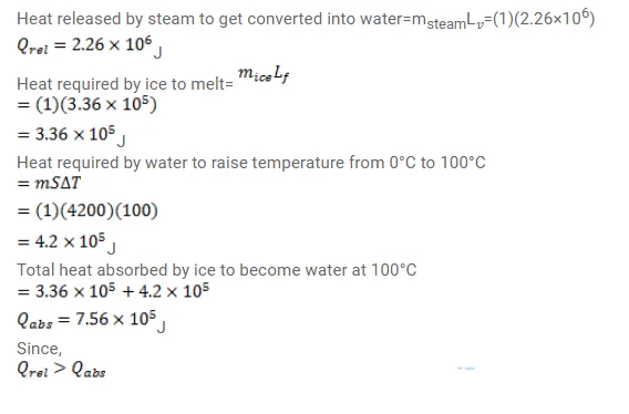 $1 \mathrm{~kg}$ of ice at $0^{\circ} \mathrm{C}$ is mixed with $1 \mathrm{~kg}$ of steam at $100^{\circ} \mathrm{C}$. What will be the composition of the systemwhen thermal equilibrium is reached? Latent heat of fusion of ice=3.36 $\times 10^{5} \mathrm{~J} / \mathrm{kg}$ and latent heat of vaporization of water $=2.26 \times 10^{6} \mathrm{~J} / \mathrm{kg}$.