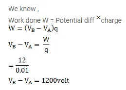 $12 \mathrm{~J}$ of work has to be done against anexisting electric field to take charge of $0.01 \mathrm{C}$ from $\mathrm{A}$ to $\mathrm{B}$. How much is the potential difference $v_{B}-v_{B}$ ?