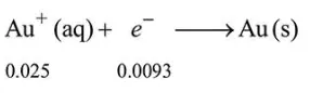 $\left(\mathrm{E}_{\mathrm{Ag}^{+} / \mathrm{Ag}}^{0}=0.80 \mathrm{~V}, \mathrm{E}_{\mathrm{Au}^{+} / \mathrm{Au}}^{0}=1.69 \mathrm{~V}\right)$