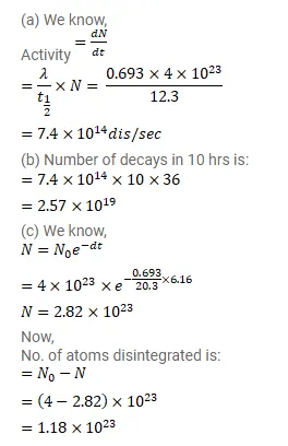 $4 \times 10^{23}$ tritium atoms are contained in a vessel. The half-life of decay of tritium nuclei is $12.3 y$. Find (a) the activity of the sample, (b) The number of decays in the next 10 hours (c) the number of decays in the next $6.15 \mathrm{y}$.