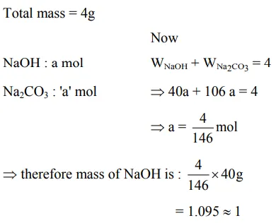 $4 \mathrm{~g}$ equimolar mixture of $\mathrm{NaOH}$ and $\mathrm{Na}_{2} \mathrm{CO}_{3}$ contains $x g$ of $\mathrm{NaOH}$ and y $g$ of $\mathrm{Na}_{2} \mathrm{CO}_{3}$. The value of $\mathrm{x}$ is g. (Nearest integer)