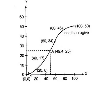 To draw less than type ogive, we plot the points (0, 0), (20, 6), (40,17), (60, 34), (80, 46), (100, 50), join all these points by free hand.