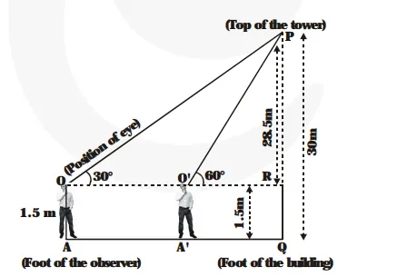PQ = 30 m is the height of the building. OA = 1.5 m is the height of the boy. Its first position is at OA OR is horizontal line through the position of the eye at O.