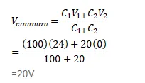 A $100 \mathrm{pF}$ capacitor is charged to a potential difference of $24 \mathrm{~V}$. It is connected to an uncharged capacitor of capacitance $20 \mathrm{pF}$. What will be the new potential difference across the $100 \mathrm{pF}$ capacitor?