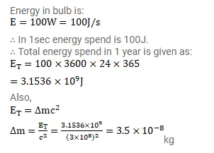 A $100 \mathrm{~W}$ bulb together with its power supply is suspended from a sensitive balance. Find the change in the mass recorded after the bulb remains on for 1year.