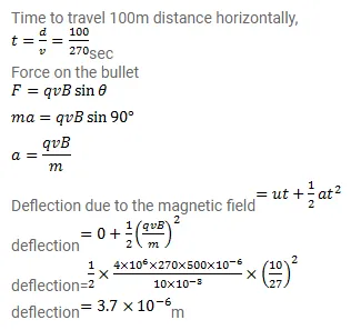A $10 \mathrm{~g}$ bullet having a charge of $4.00 \mu C$ is fired at a speed of $270 \mathrm{~m} / \mathrm{s}$ in a horizontal direction. A vertical magnetic field of $500 \mu T$ exists in the space. Find the deflection of the bullet due to the magnetic field as it travels through $100 \mathrm{~m}$. Make appropriate approximations.