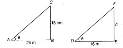 Let BC = 15 m be the tower and its shadow AB is 24 m. At that time ∠CAB = 8, Again, let EF = h be a telephone pole and its shadow DE = 16 m. At