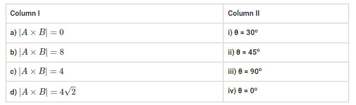 |A|=2 and |B|=4, then match the relations in column I with the angle $\theta$ between $\mathrm{A}$ and $\mathrm{B}$ in column II.