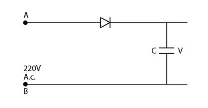 A 220 V A.C. supply is connected between points A and B in the figure. What will be the potential difference V across the capacitor?