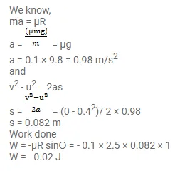 A $250 \mathrm{~g}$ block slides on a rough horizontal table. Find the work done by the frictional force in bringing the block to rest if it is initially moving at a speed of $40 \mathrm{~cm} / \mathrm{s}$. If the friction coefficient between the table and the block is $0.1$, how far does the block move before coming to rest?
