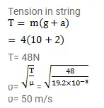 A $4.0 \mathrm{~kg}$ block is suspended from the ceiling of an elevator through a string having a linear mass density of $19.2 \times 10^{-3} \mathrm{~kg} / \mathrm{m}$. Find the speed (with respect to the string) with which a wave pulse can proceed on the string if the elevator accelerates up at the rate of $2.0 \mathrm{~m} / \mathrm{s}^{2}$.
