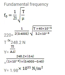 A $40 \mathrm{~cm}$ wire having a mass of $3.2 \mathrm{~g}$ is stretched between two fixed supports $40.05 \mathrm{~cm}$ apart. In its fundamental mode, the wire vibrates at $220 \mathrm{~Hz}$. If the area of cross-section of the wire is $1.0 \mathrm{~mm}^{2}$, find the Young's modulus.