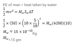 A $50 \mathrm{~kg}$ man is running at a speed of $18 \mathrm{~km} / \mathrm{h}$. If all the kinetic energy of the man can be used to increase the temperature of water from $20^{\circ} \mathrm{C}$ to $30^{\circ} \mathrm{C}$, how much water can be heated with this energy?