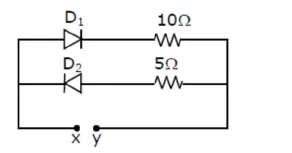 A $5 \mathrm{~V}$ battery is connected across the points $\mathrm{X}$ and $\mathrm{Y}$. Assume $\mathrm{D}_{1}$ and $\mathrm{D}_{2}$ to be normal silicon diodes. Find the current supplied by the battery if the tve terminal of the battery is connected to point $X$.