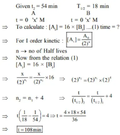A and B decompose via first order kinetics with half-lives $54.0 \mathrm{~min}$ and $18.0 \mathrm{~min}$ respectively. Starting from an equimolar non reactive mixture of $\mathrm{A}$ and $\mathrm{B}$, the time taken for the concentration of $A$ to become 16 times that of $B$ is_____________ min. (Round off to the Nearest Integer).
