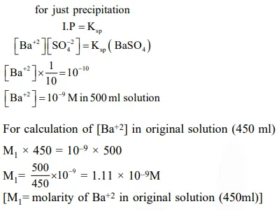 A aqueous solution contains an unknown concentration of $\mathrm{Ba}^{2+}$. When $50 \mathrm{~mL}$ of a $1 \mathrm{M}$ solution of $\mathrm{Na}_{2} \mathrm{SO}_{4}$ is added, $\mathrm{BaSO}_{4}$ just begins to precipitate. The final volume is $500 \mathrm{~mL}$. The solubility product of $\mathrm{BaSO}_{4}$ is $1 \times 10^{-10}$. What is the original concentration of $\mathrm{Ba}^{2+}$ ?