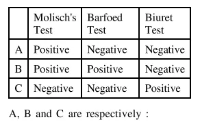 A, B and C are three biomolecules. The results of the tests performed on them are given below: