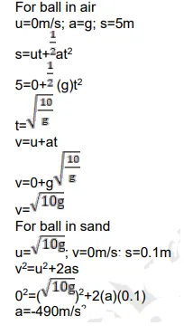 A ball is dropped from a height of $5 \mathrm{~m}$ onto a sandy floor and penetrates the sand up to $10 \mathrm{~cm}$ before coming to rest. Find the retardation of the ball in sand assuming it to be uniform.