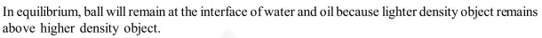 A ball is made of a material of density $\rho$ where $\rho_{\text {oil }}<\rho<\rho_{\text {water }}$ with $\rho_{\text {oil }}$ and $\rho_{\text {water }}$ representing the densities of oil and water, respectively. The oil and water are immiscible. If the above ball is in equilibrium in a mixture of this oil and water, which of the following pictures represents its equilibrium position ?