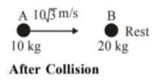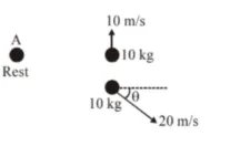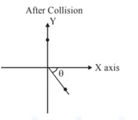 A ball of mass $10 \mathrm{~kg}$ moving with a velocity $10 \sqrt{3} \mathrm{~ms}^{-1}$ along X-axis, hits another ball of mass $20 \mathrm{~kg}$ which is at rest. After collision, the first ball comes to rest and the second one disintegrates into two equal pieces. One of the pieces starts moving along Y-axis at a speed of $10 \mathrm{~m} / \mathrm{s}$. The second piece starts moving at a speed of $20 \mathrm{~m} / \mathrm{s}$ at an angle $\theta$ (degree) with respect to the $X$-axis.