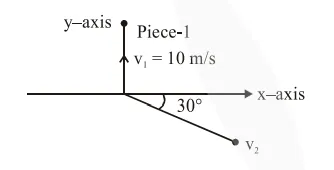A ball of mass $10 \mathrm{~kg}$ moving with a velocity $10 \sqrt{3} \mathrm{~m} / \mathrm{s}$ along the $\mathrm{x}$-axis, hits another ball of mass $20 \mathrm{~kg}$ which is at rest. After the collision, first ball comes to rest while the second ball disintegrates into two equal pieces. One piece starts moving along $y$-axis with a speed of 10 $\mathrm{m} / \mathrm{s}$. The second piece starts moving at an angle of $30^{\circ}$ with respect to the x-axis. The velocity of the ballmoving at $30^{\circ}$ with $x$-axis is $\mathrm{x} \mathrm{m} / \mathrm{s}$. The configuration of pieces after collision is shown in the figure below. The value of $x$ to the nearest integer is________.