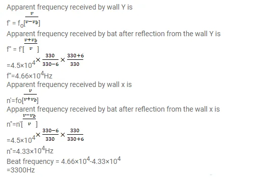 A bat emitting an ultrasonic wave of frequency $4.5 \times 10^{4} \mathrm{~Hz}$ flies at a speed of $6 \mathrm{~m} \mathrm{} \mathrm{s}^{-1}$ between two parallel walls. Find the fractional heard by the bat and the beat frequencies heard by the bat and the beat frequency between the two. The speed of sound is $330 \mathrm{~m} \mathrm{~s}^{-1}$.